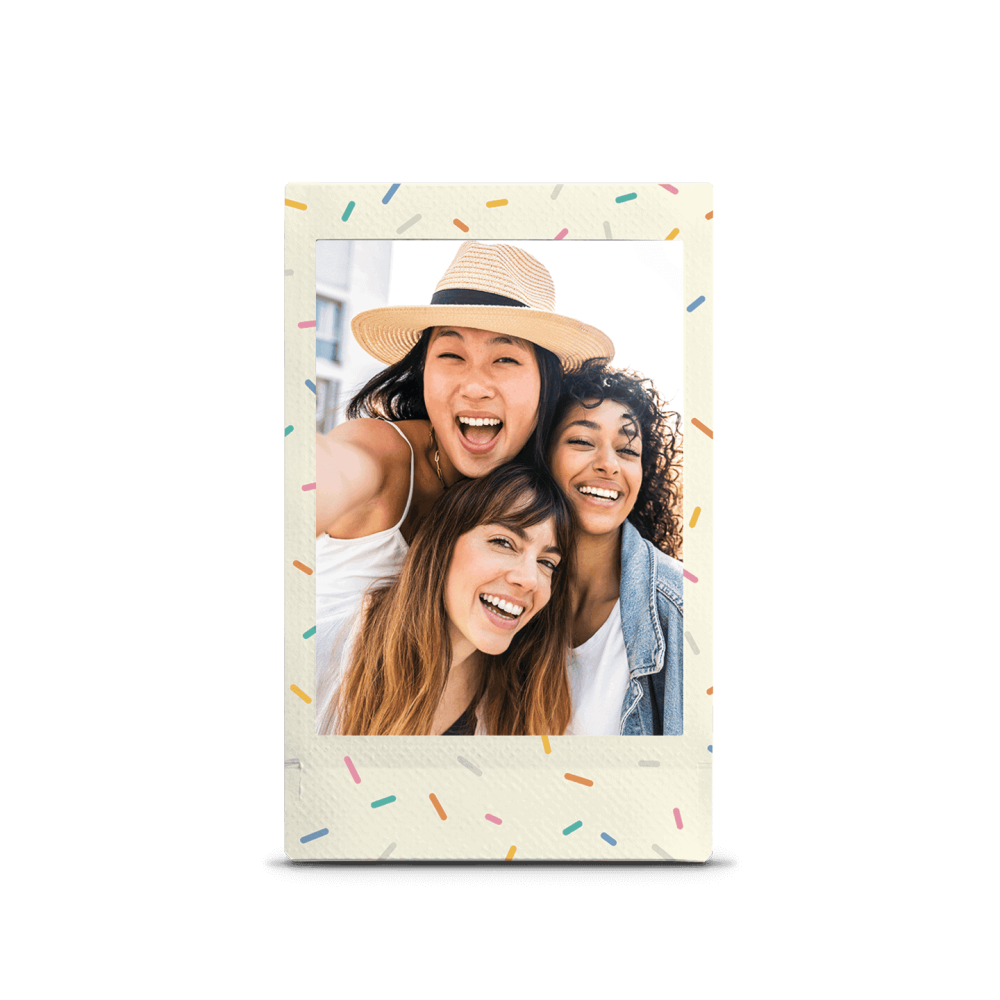 تتميز عبوات أفلام instax™ mini Sprinkles الفورية بإطار مزيّن برشّات ملونة ممتعة تضيف لمسة لطيفة ومليئة بالحيوية إلى صورك.