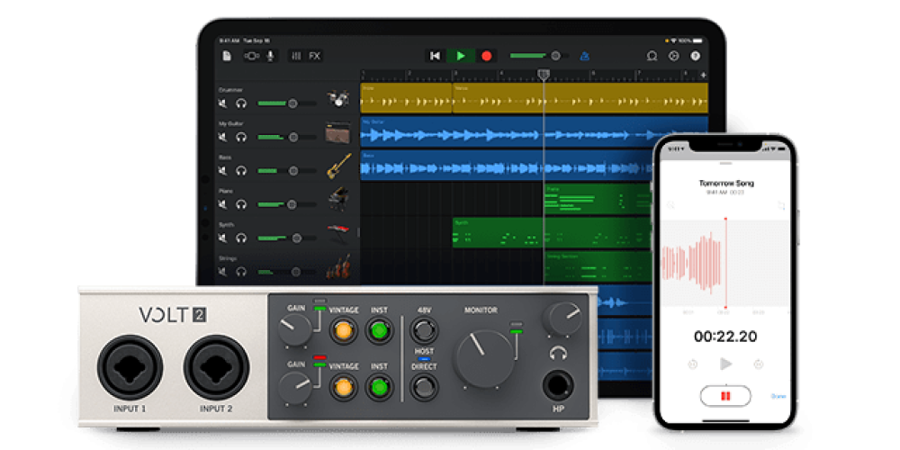 - في السفر خفيفا قم بتوصيل Volt 2 بجهاز iPad أو iPhone الخاص بك، ويمكنك بسهولة إنشاء إيقاعات وعينات، وتسجيل تدريبات فرقتك الموسيقية، وتحرير الأغاني في أي مكان.*