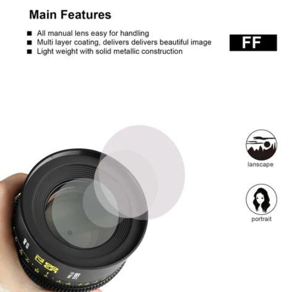 هذه هي ثالث عدسة سينمائية كاملة الإطار من Meike وتنضم الآن إلى عائلة العدسات السينمائية ذات الإطار الكامل. يغطي دائرة صورة 45 مم. وهي متوفرة في حوامل PL و Canon EF و Canon RF و Sony E و Panasonic L.