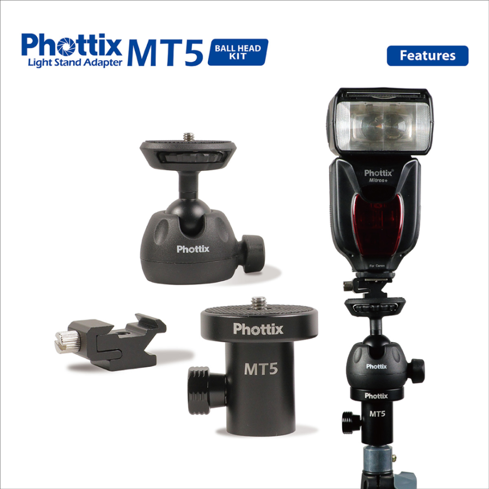 تشتمل مجموعة رأس الكرة لمحول MT5 Light Stand على رأس كرة ومحول حامل خفيف ومشبك للهاتف الذكي وحذاء بارد. يمكن تجميع هذه الملحقات ببساطة باستخدام محول حامل ضوء. وهو متوافق للتثبيت مع أي كرة رأس أو قضيب عرضي أو جهاز به أنثى 3/8 بوصة لأي ملحقات تصوير للأطفال مقاس 5/8 بوصة (16 مم) أو ملحقات تصوير جونيور 1-1 / 8 بوصة (بقطر أنبوب العمود 16 مم). مثل حوامل الضوء ، C-Stands ، حامل ذراع الرافعة ، المشابك المتعددة ، والمزيد.