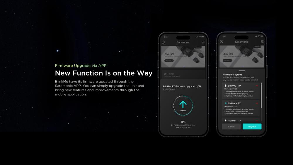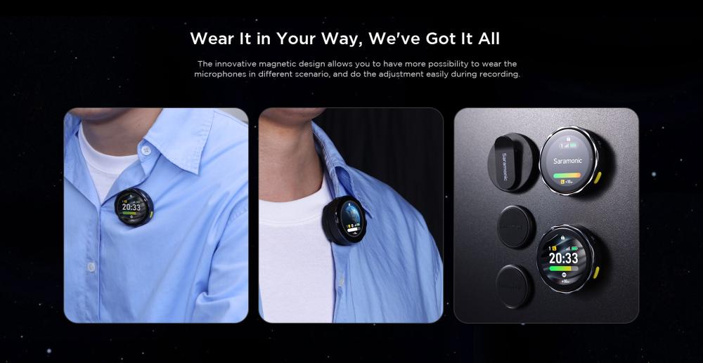 - تحتوي أجهزة الإرسال على ميكروفون شامل مدمج ويمكن تثبيته على الملابس باستخدام المشابك المغناطيسية وحوامل التثبيت. إنها تتميز بوقت تشغيل يصل إلى 9 ساعات ، وقياس في الوقت الفعلي ، وكتم الصوت والمزيد