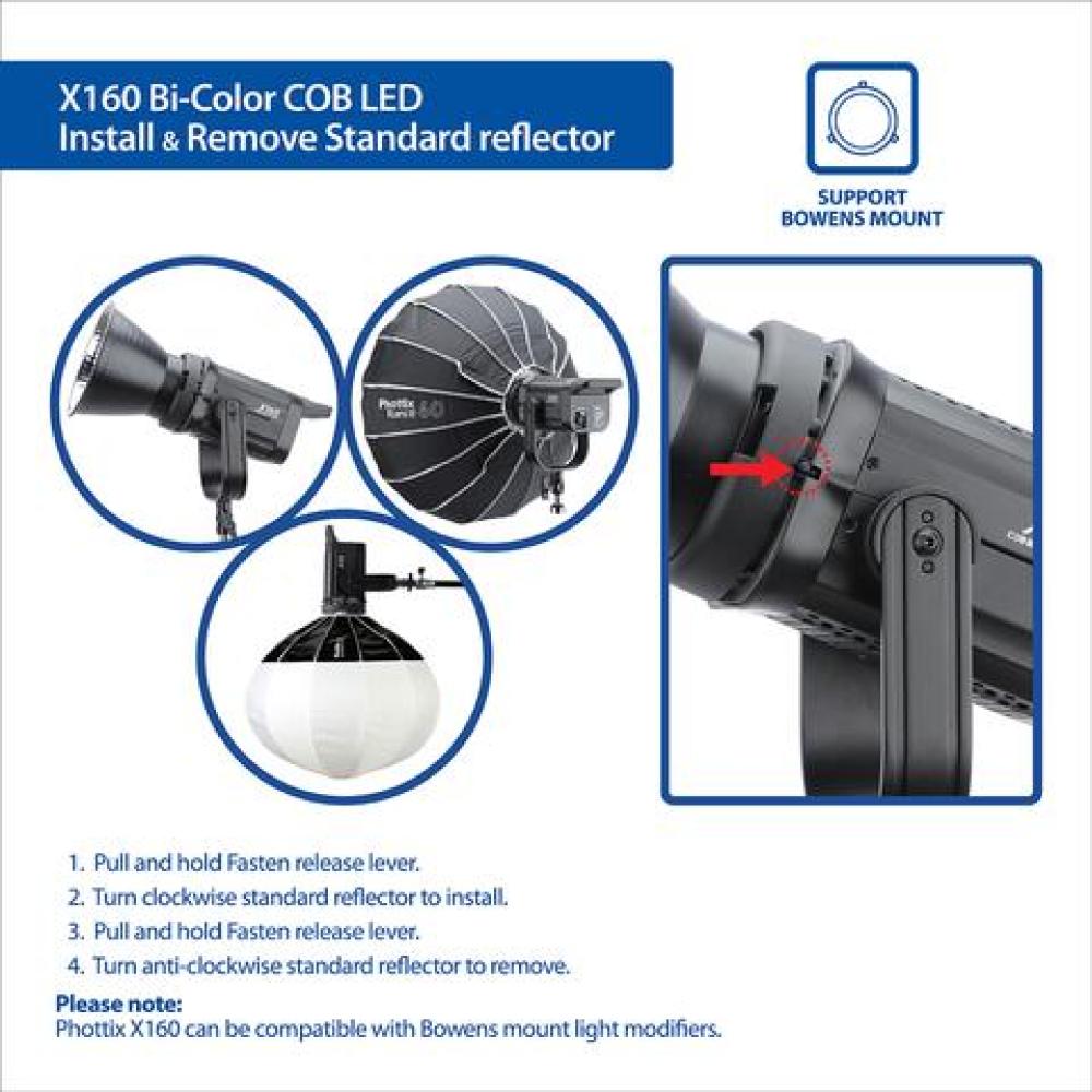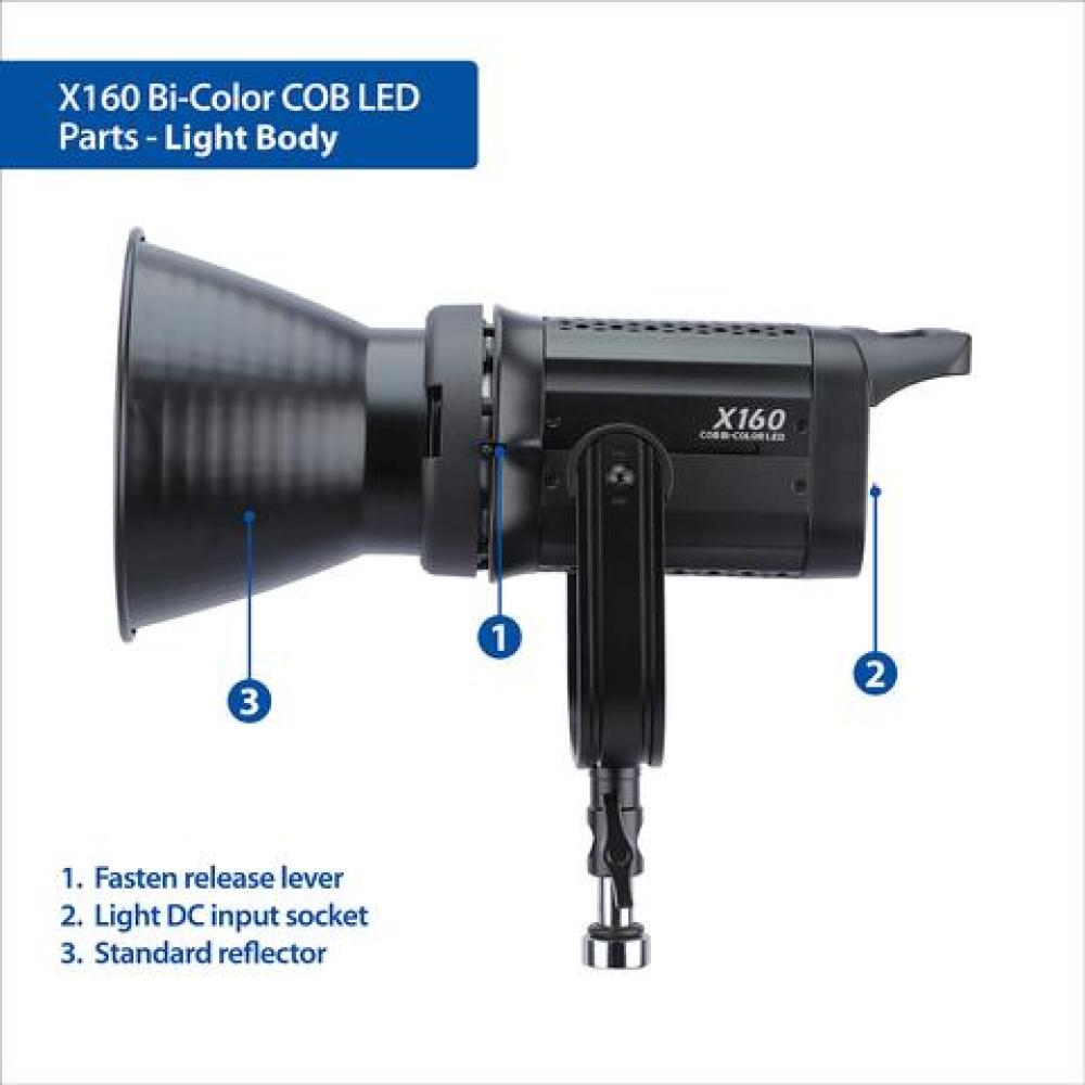 The X160 LED lamp features a powerful 150W output power and delivers excellent light quality across the 2800-6800K color temperature range. Equipped with a Bowens mount, the Phottix X160 LED lamp can be used with a wide range of popular lighting fixtures. Lumens reach 37,000 lux at 1 m with a standard reflector.