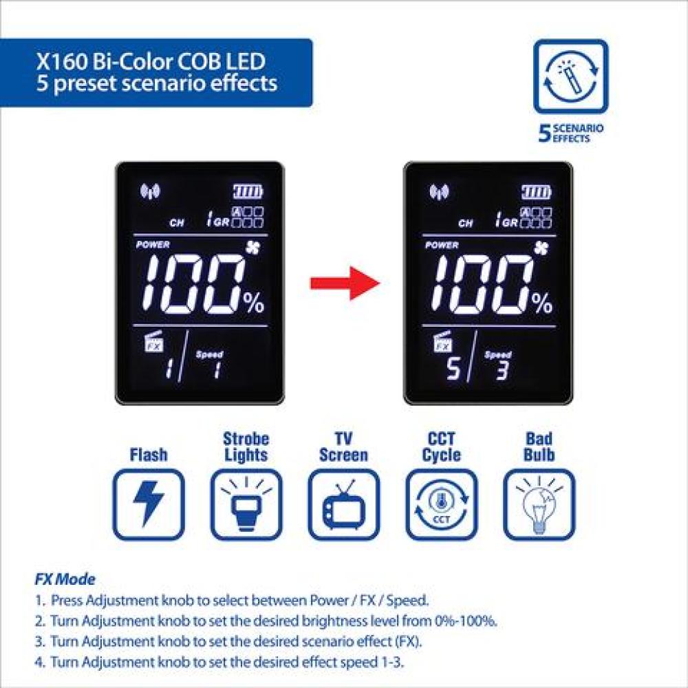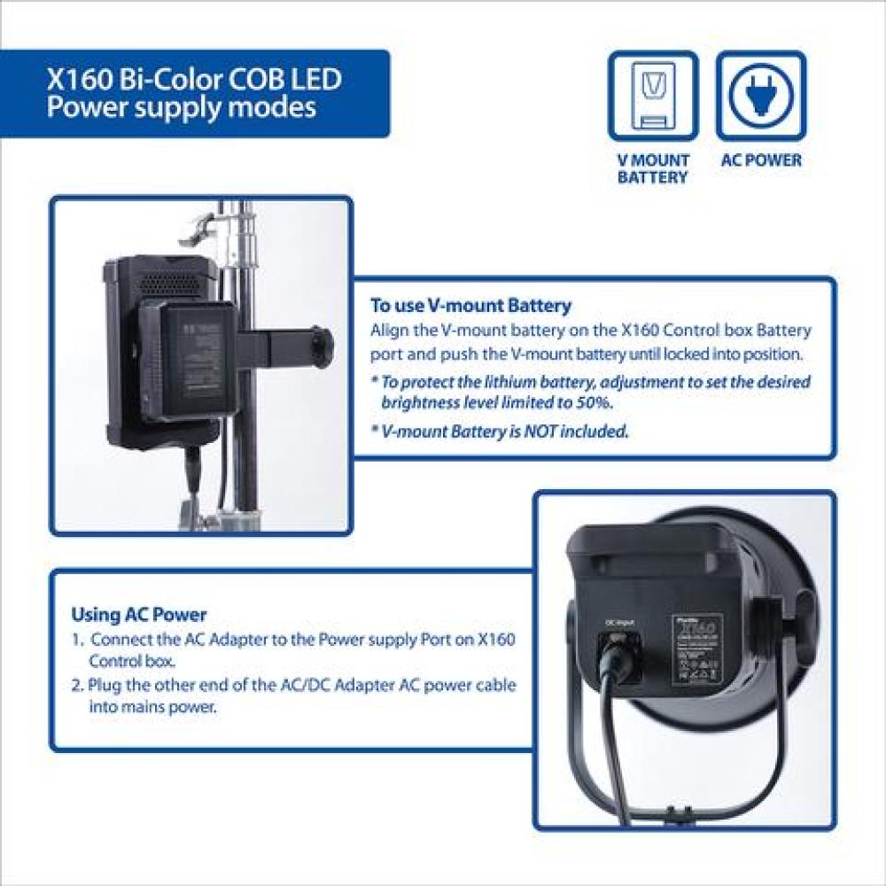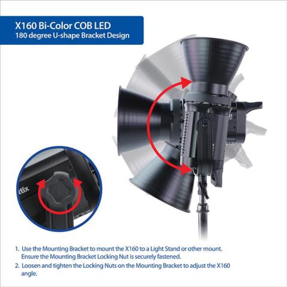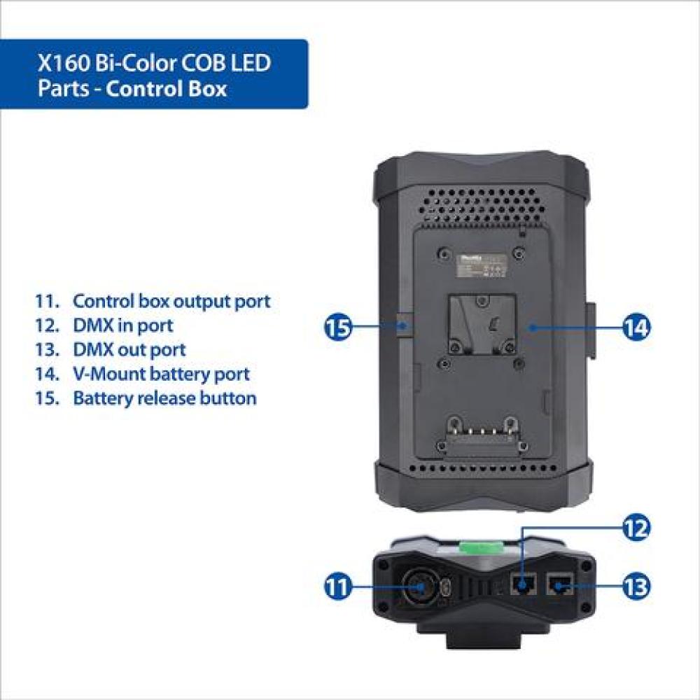 The X160 LED also features a separate external controller with an LCD screen where you can adjust brightness and color temperature, using five built-in scenario effect modes and a DMX mode. The X160 LED can also be controlled from a smartphone app via Bluetooth connectivity available for Android and iOS. This lamp can be powered by AC power or a V-mount lithium battery.